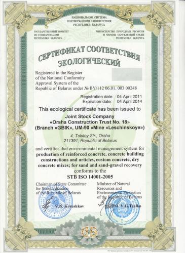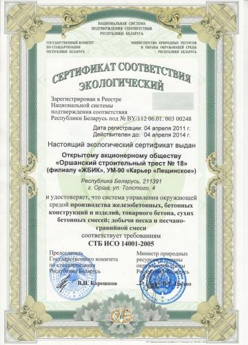 Сертификат соответствия экологический СТБ ИСО 14001-2005